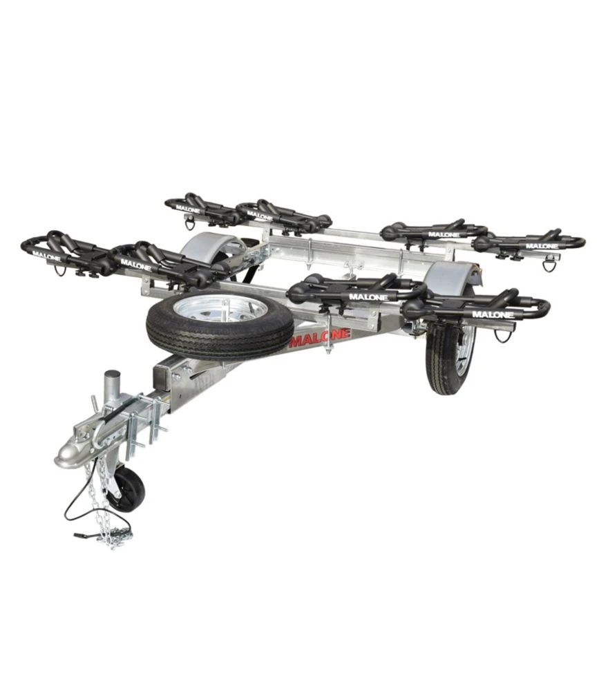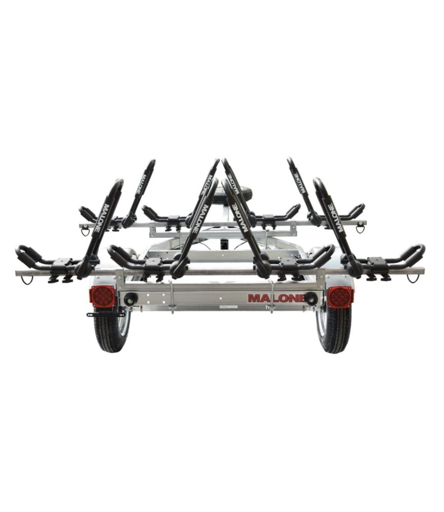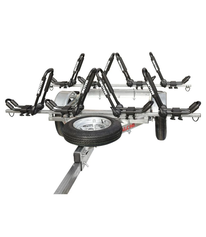 This handy trailer provides a convenient solution for carrying multiple kayaks or canoes. Instead of loading your boats onto the roof of a vehicle, simply load them onto the 30″-high crossbars and tow them. Package includes 4 J-style kayak carriers.